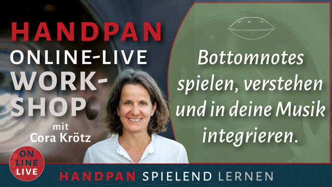 In diesem 3-teiligen Online-Live-Workshop zeige ich dir Schritt für Schritt, wie du deine Bottomnotes ganz natürlich in dein Spiel und in deine Musik integrierst. Du bekommst konkrete Spielideen, einfache Übungen und musikalische Zusammenhänge, die du direkt auf deiner eigenen Handpan ausprobieren kannst.