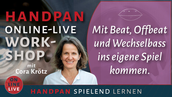 Jeder Workshop beginnt mit einem Input-Teil (Neuer Rhythmus, Fingertechnik oder Unabhängigkeitsübung). Dieser wird aufgezeichnet und ist dann in meiner Online-Akademie als Kurs einzusehen. So kannst du die Lektionen auch Zuhause anschauen und Handpan intensiv ohne Gruppe (und ohne Feedback) trotzdem mitmachen.