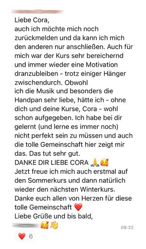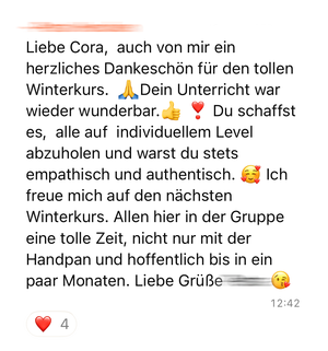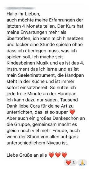Jeder Workshop beginnt mit einem Input-Teil (Neuer Rhythmus, Fingertechnik oder Unabhängigkeitsübung). Dieser wird aufgezeichnet und online gestellt. So kannst du die Lektionen auch Zuhause anschauen und Handpan intensiv ohne Gruppe (und ohne Feedback) trotzdem mitmachen.